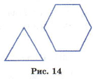 С помощью транспортира разделите одну окружность на 6, а другую — на 3 равные дуги. Постройте многоугольники, изображённые на рисунке 14.