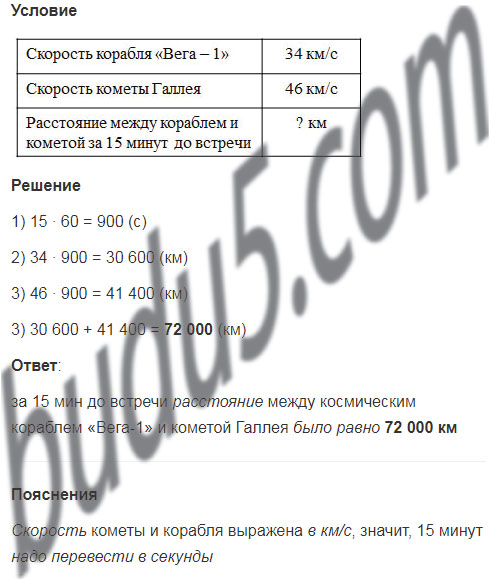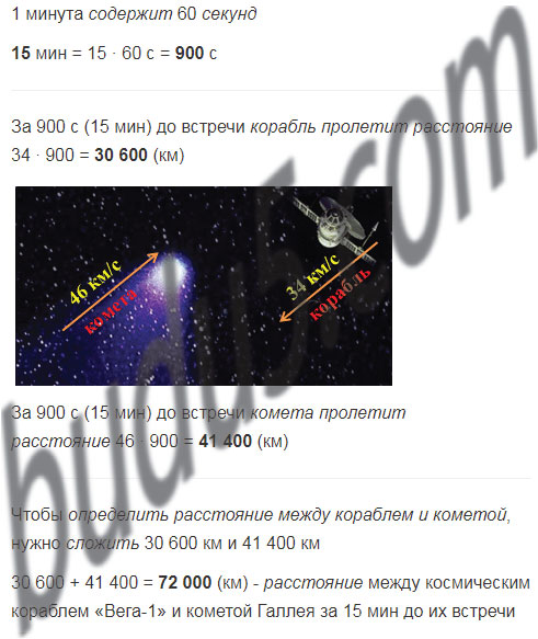 Космический корабль «Вега-1» двигался к комете Галлея со скоростью 34 км/с, а сама комета двигалась ему навстречу со скоростью 46 км/с. Какое расстояние было между ними за 15 мин до встречи?