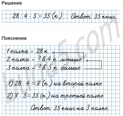 194. На первой полке 28 книг, на второй - в 4 раза меньше, чем на первой, а на третьей - в 5 раз больше, чем на второй. Сколько книг на третьей полке?