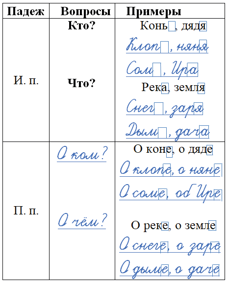 | П. п. | О ком? | О коне, о дяде О слоне, о Ване О собаке, о кроте |