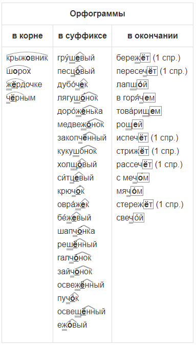 Распределите слова по видам орфограмм на месте пропусков (см. таблицу). Обозначьте условия выбора букв о, ё и е после шипящих.