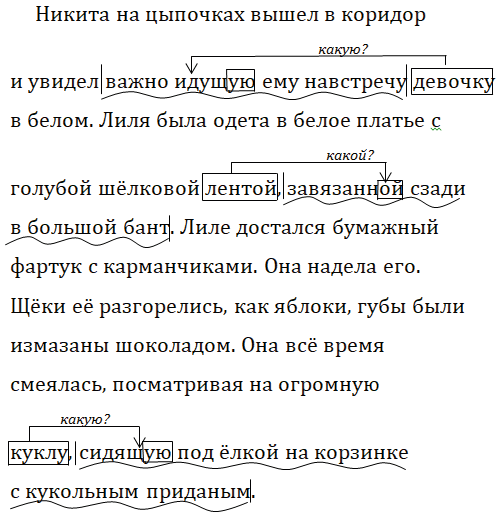 Никита на ц..почках вышел в к..ридор и увидел важно идущ..ю ему навстречу девочку в белом. Лиля была одета в белое платье с голубой ш..лковой лентой завязанной сзади в больш..й бант. Лиле достался бумажный фартук с карманчиками. Она надела его. Щёки её разгорелись, как яблоки, губы были измазаны шоколадом. Она всё время смеялась, посматр..вая на огромную куклу, сидящ..ю под ёлкой на корзинке с кукольным приданым.