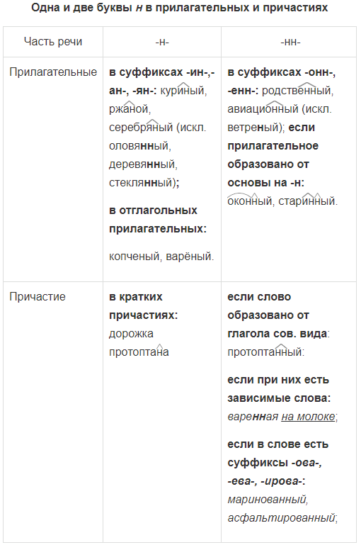 Отберите и систематизируйте материал, составьте таблицу «Одна и две буквы н в прилагательных и причастиях». Поместите слева в графах названия частей речи, а справа — количество букв н. Заполните её примерами.