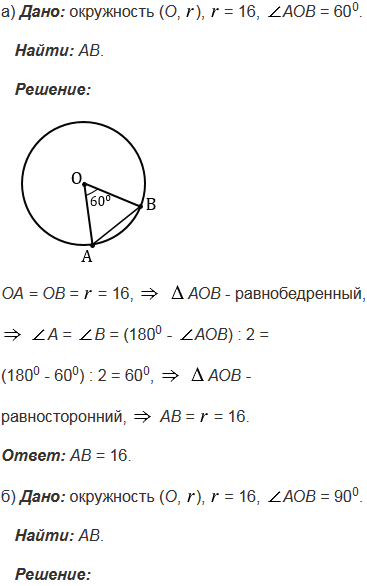 Радиус окружности с центром О равен 16. Найдите хорду АВ, если: а)