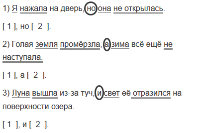 1) Я нажала на дверь, но она не открылась. 2) Голая земля промёрзла, а зима всё ещё не наступала. 3) Луна вышла из-за туч, и свет её отразился на поверхности озера.