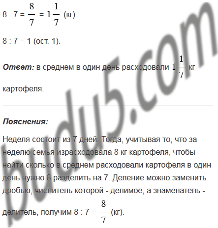 За неделю семья израсходовала 8 кг картофеля. Сколько килограммов картофеля расходовали в среднем в один день?