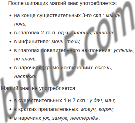 Изучите схему. Расскажите об употреблении ь после шипящих в словах различных частей речи.