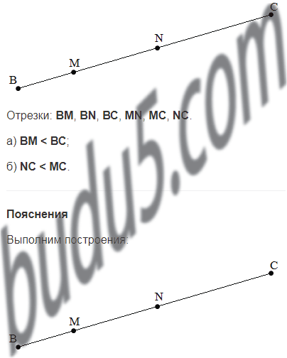 Начертите отрезок ВС и отметьте на нём точки М и N так, чтобы точка М лежала между точками В и N. Запишите все получившиеся отрезки с концами В, М, N и С. Сравните отрезки: