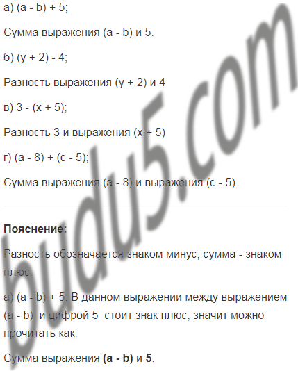 Выражение (а + 3) - (с - 2) можно прочитать так: "разность выражения а плюс 3 и выражения с минус 2".