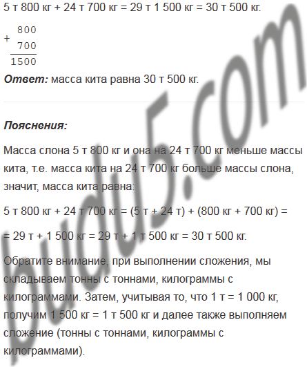 Масса слона на 24 т 700 кг меньше массы кита. Какова масса кита, если масса слона 5 т 800 кг?