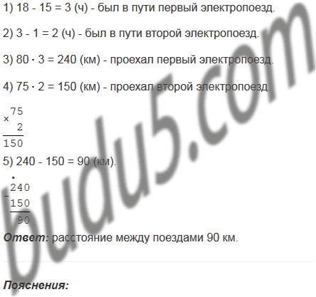 В 15 ч со станции вышел электропоезд со скоростью 80 км/ч, а через 1 ч с той же станции вслед за ним вышел второй электропоезд со скоростью 75 км/ч. Какое расстояние будет между ними в 18 ч того же дня?