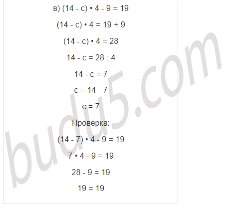 | в) (14 - с) • 4 - 9 = 19 | |