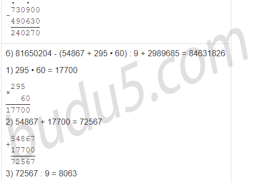 | б) 81650204 - (54867 + 295 • 60) : 9 + 2989685 |